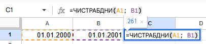=ЧИСТРАБДНИ(A1; A2) (=NETWORKDAYS(A1, A2))