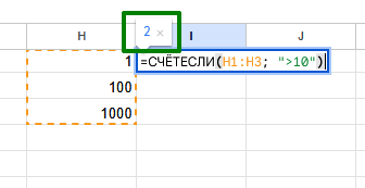 =СЧЁТЕСЛИ(B1:B10; ">10") (=COUNTIF(B1:B10, ">10")) — посчитает ячейки в диапазоне B1:B10, значение которых больше 10.