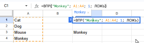 =ВПР(E1; A1:B100; 2; ЛОЖЬ) (=VLOOKUP(E1, A1:B100, 2, FALSE)) — ищет значение E1 в столбце A, и возвращает соответствующее значение из столбца B. Первым аргументом вы можете передать значение или ячейку со значением.