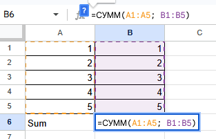 =СУММ(A1:A10; B1:B10)Английский (США, Великобритания) и некоторые другие — разделитель запятая (,). Пример:
