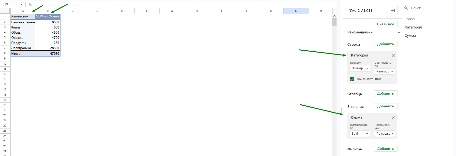Например, если у вас есть таблица продаж с колонками "Товар", "Категория", "Сумма", вы можете быстро получить сумму продаж по каждой категории, перетащив "Категорию" в строки, а "Сумму" — в значения (с агрегацией СУММ).