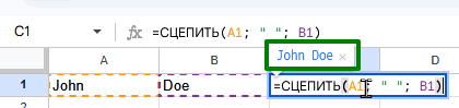 =СЦЕПИТЬ(A1; " "; B1) (=CONCATENATE(A1, " ", B1)) — объединит текст из A1 и B1 через пробел.