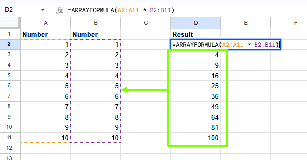 =ARRAYFORMULA(A1:A10 * B1:B10) — умножит каждую строку диапазона A на соответствующую строку диапазона B.